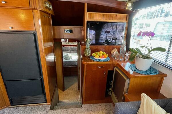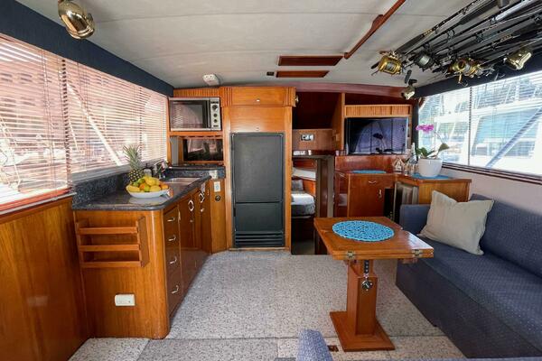 - Port Side L-Shaped Galley with Built-in Upper and Lower Teak Cabinets