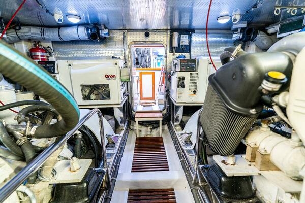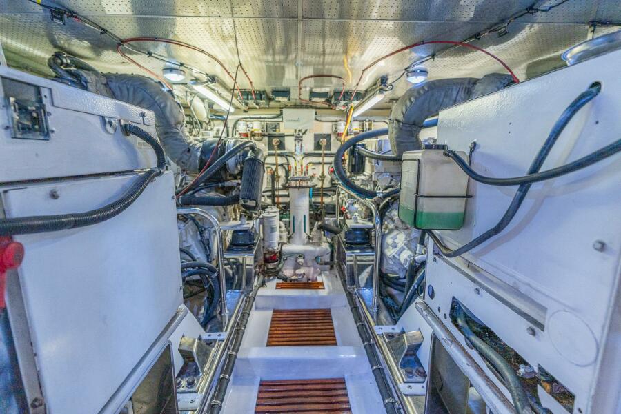 Most Captains often tell us that we have the best Engine rooms they have ever seen! With full-standing headroom and generous access to all components. The area is well lit with upgraded LED lighting. There are (4) blowers to cool the space down after a run. Each diesel engine has dual redundant Racor fuel filters. The fuel system is upgraded with 1930 gallons of fuel that can be filled from either side of the protected exterior walkway. The engine beds are solid polished stainless steel and secure the engine vibration isolation mounts to the stringers. They run all the way past the transmissions to accept the thrust load of the aqua drive units. The dripless shafts seals have a crossover tube that supplies water from both engines so you can safely run on one engine if needed. Centerline forward in the engine room, you will find a large single sea chest to provide raw water flow to each of the engines, generation, A/C system, etc. All components of the yacht that require raw water have their own shut-off valve on the sea chest, so individual components can be isolated easily. Having one thru hull opening and a watertight engine room door vastly reduces possible leak points and ensures the vessel maintains a high level of seaworthiness and safety.