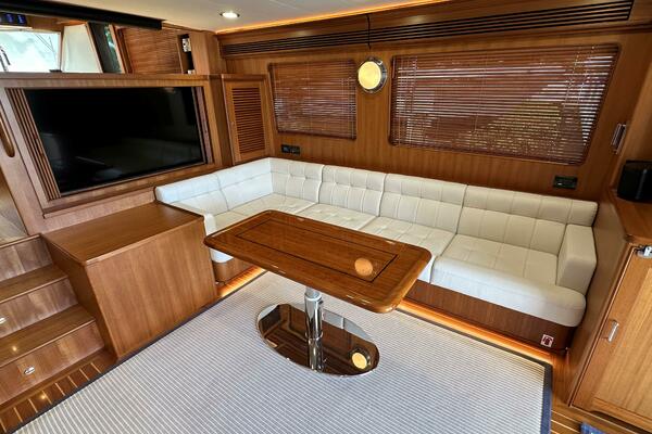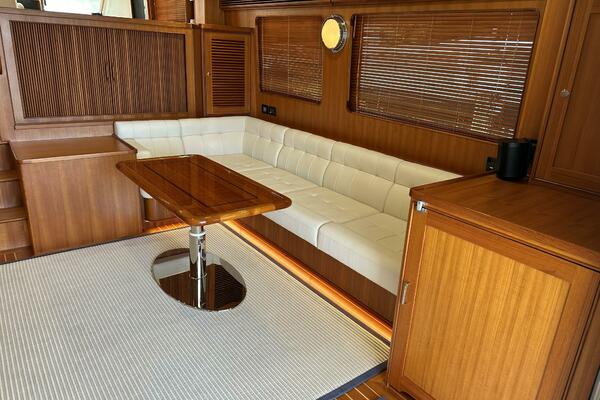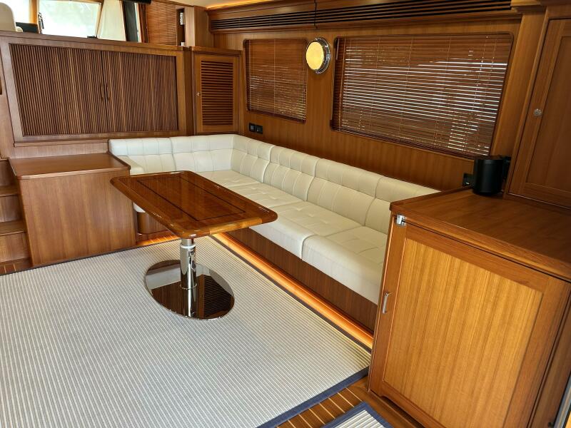 - Custom layout that includes a L- shaped seating area with teak table to starboard and bench to port