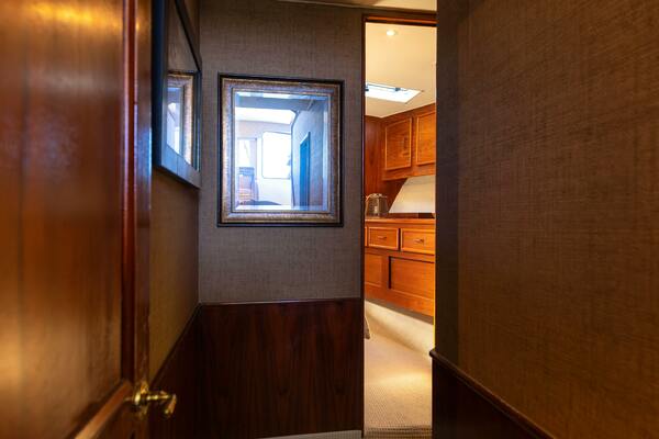 The spacious salon includes a custom-built couch with generous storage beneath, along with a large settee ideal for dining and entertaining. Moving forward, the three staterooms provide ample space and thoughtful separation for guests, making LUCKY MARLIN a perfect platform for extended cruising or serious sportfishing adventures.
