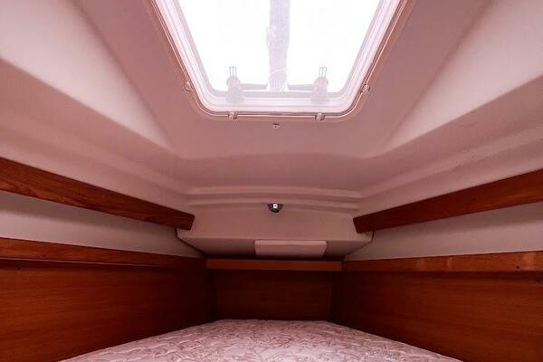 The aft cabin has a door from the salon and stand up head room as you step in. There is plenty of storage space and ventilation from a large hatch.