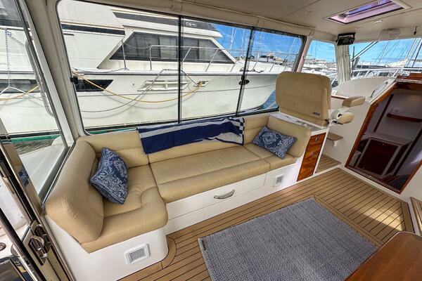 Southern Cross is uniquely equipped with an aft glass enclosure into the pilothouse which further reduces the noise level while a cursing speeds and creates a more substantial feel to the pilothouse.