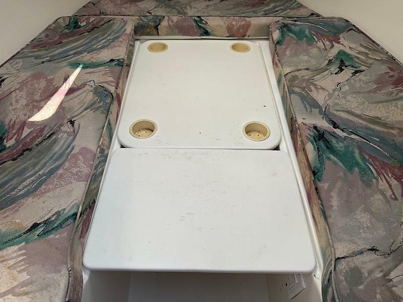 V berth with collapsible table, sink, stove, overhead rod storage