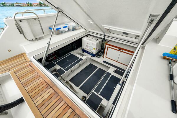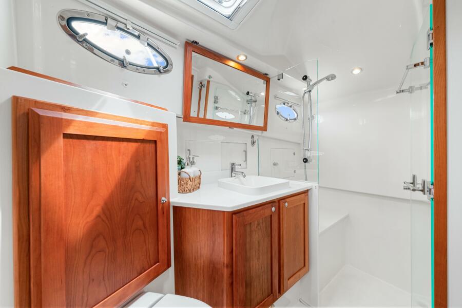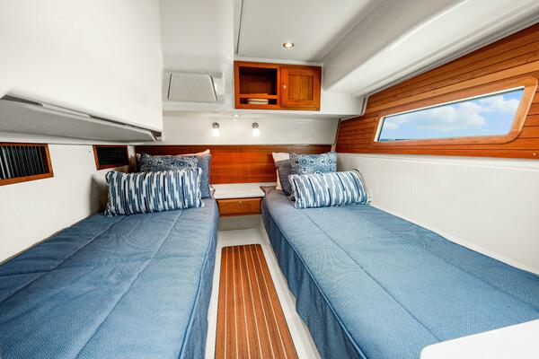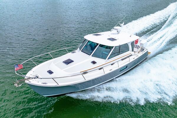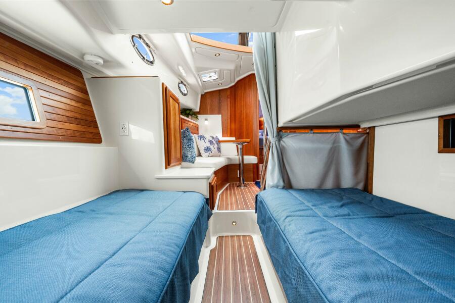 The Back Cove 39O is the fastest and quietest Back Cove model yet. Her cockpit is a fun and relaxing space with transom gates to port and starboard, a U-shaped settee across from an aft-facing seat, and a central table for al fresco dining and entertaining. Expansive storage below the cockpit is easily accessed through a large actuated hatch, and provides generous accommodations for all of your water toys and gear.