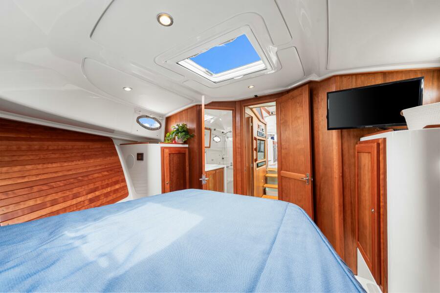 Below deck, owners and guests can relax in the privacy of a lower lounge and stream a favorite program to the Smart TV. The spacious owners’ cabin forward offers a queen-sized island berth and private access to the head and shower. For the crew, two single beds in the guest cabin are secluded, well proportioned, and comfortable.