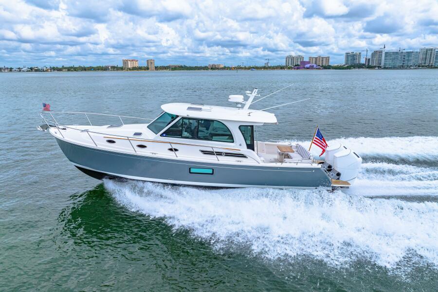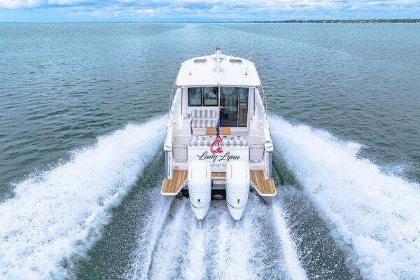 She has a 300 mile+ range at cruise, and a top-end speed of 46-knots with twin 600 outboards. The 39O hull design features Back Cove’s proprietary Trailing Edge Lifting Surface (TRELIS) Ⓓ for optimal handling and performance.