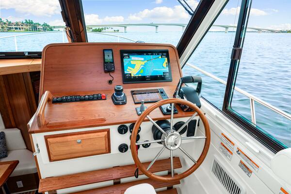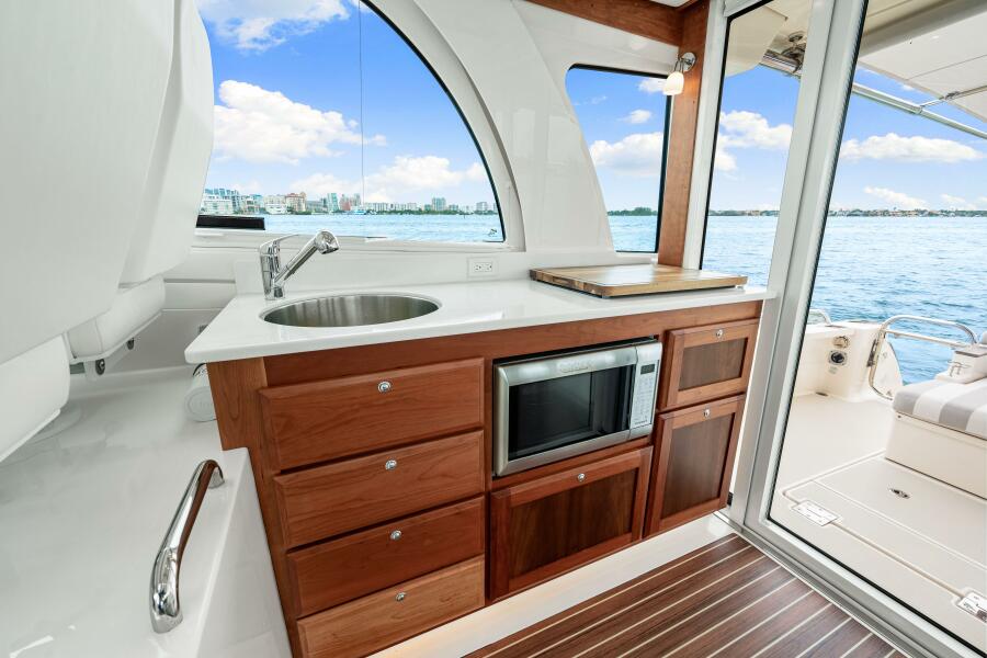The 39O offers a hard back for a fully enclosed helm deck; a unique design in this segment, which allows for climate-controlled comfort and an extended boating season with optimal protection from the elements. Her indoor social spaces keep everyone connected, featuring a galley up design and side-by-side captain and mate seats opposite a comfortable U-shaped settee. The result is a perfect space where the crew can enjoy a meal, or lounge while staying out of the sun or the rain.