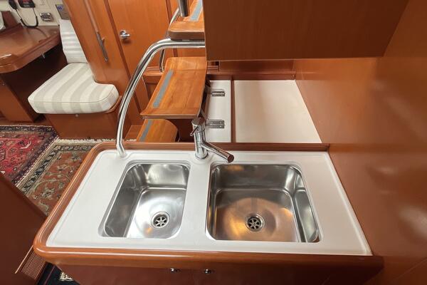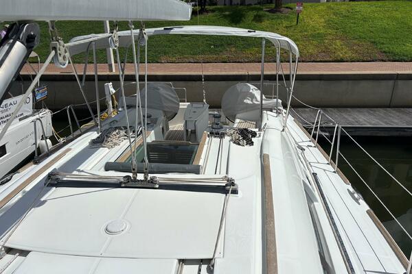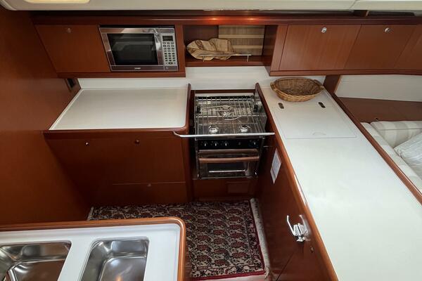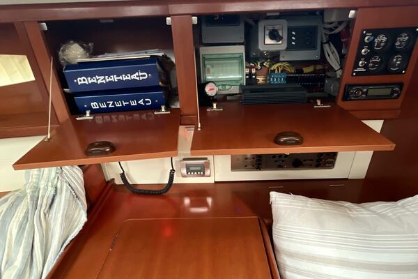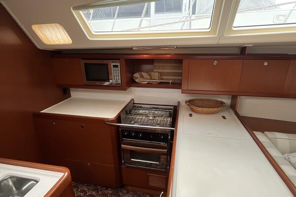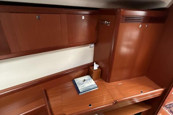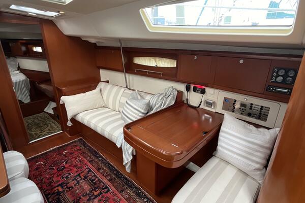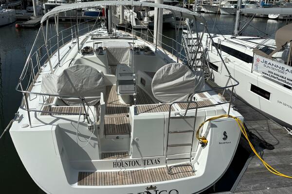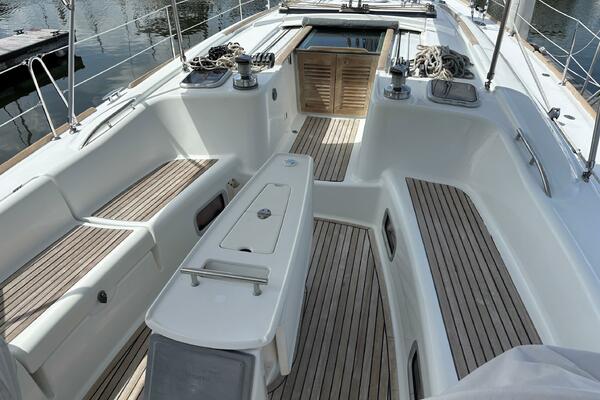 On deck, the wide cockpit is designed for comfort and functionality, featuring twin helm stations, a large folding table, and easy access to the swim platform. The in-mast furling mainsail and furling genoa make sail handling simple and efficient, even with a small crew. All lines are led aft to the cockpit for added safety.