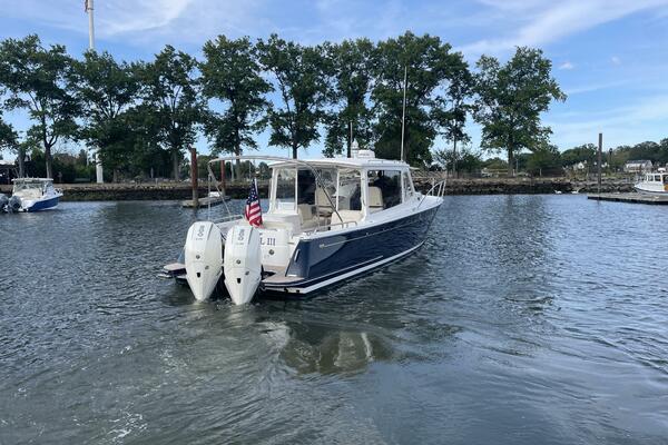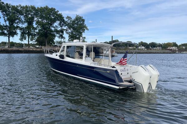 Twin Mercury 300 hp V8's with joystick steering and Platinum warranty through June 2028.