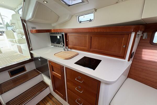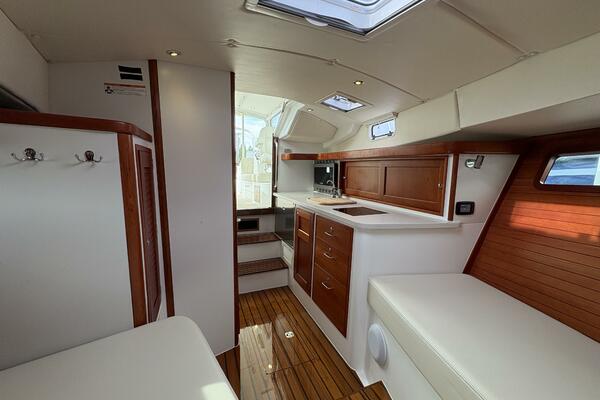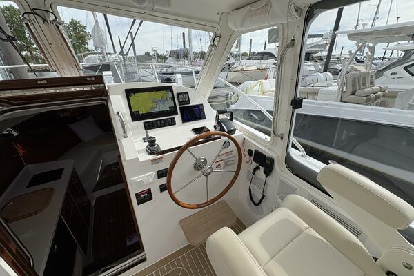 The all-weather pilothouse offers 360° visibility and seamless indoor/outdoor living, keeping you comfortable in every season. Unwind below in classic nautical styling that features a full-size wet head with shower, full galley to port, and a roomy V-berth. Climate control via two-zone air conditioning (pilothouse and cabin).