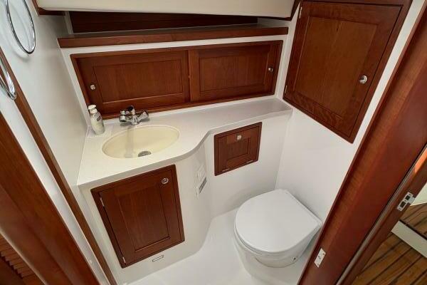 - Enclosed head/shower to starboard w/ solid surface countertop, sink, and vanity cabinets