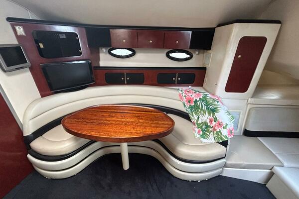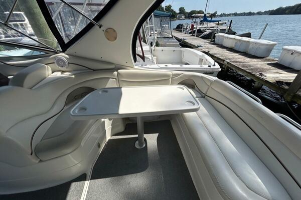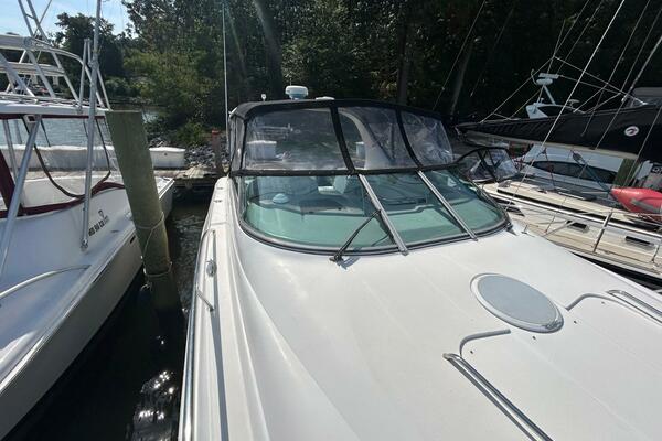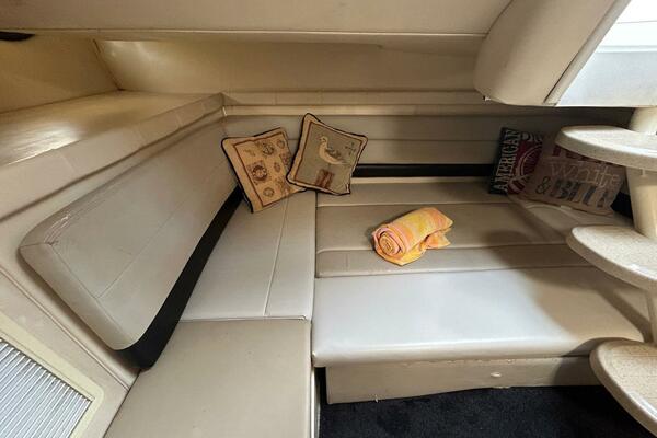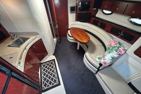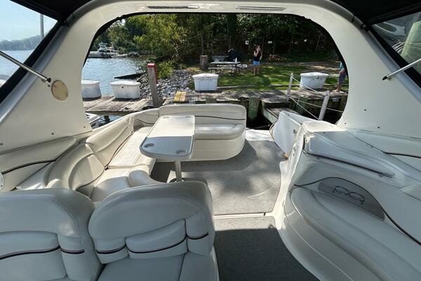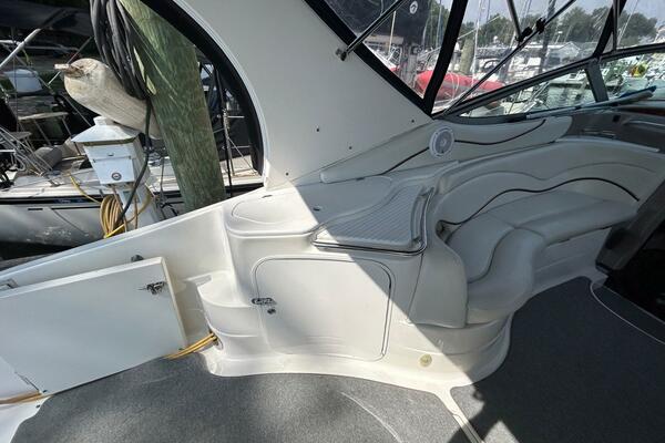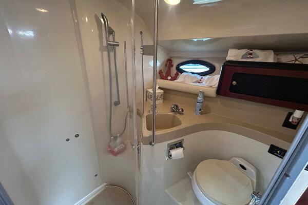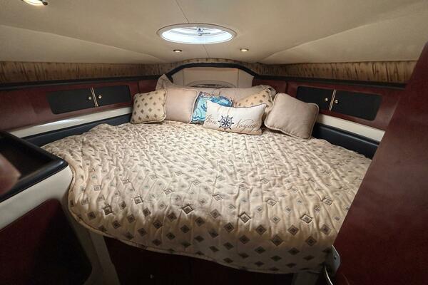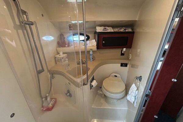 Here's a very nice Wellcraft 3700 Martinique with all the right equipment to include a Kohler generator in a sound shield, AC/HEAT, fully complimented galley, vacu-flush fresh water toilet system, head compartment with separate stall shower, cherry wood finishes throughout, swim platform, cockpit carpets, full canvas enclosure, windlass anchor, touch screen Garmen GPS, walk-thru windshield to the bow deck and more. Good styling and a spacious interior make the 3700 Martinique a desirable big family cruiser. She is built on a great running deep-V hull with a wide beam. She sleeps 6 in a mid-cabin floor plan that seems surprisingly open and comfortable. In a departure from most mid-cabins, the forward stateroom features a solid door that separates it from the rest of the cabin. The head has a nice layout with a separate shower stall.