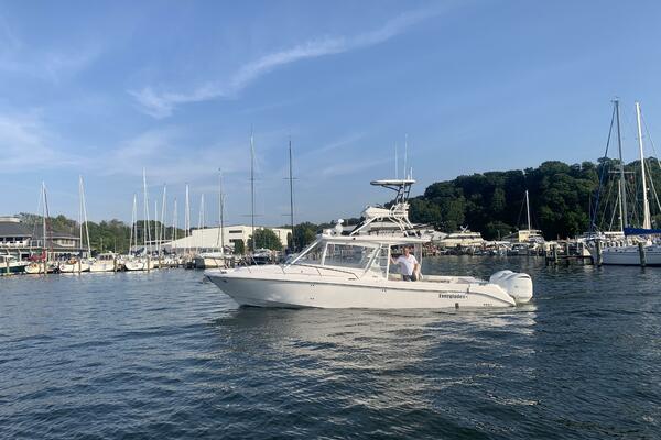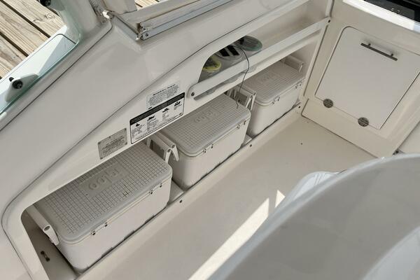 Everglades' 350LX is a versatile fishing boat with a spacious cuddy cabin that can easily accommodate overnight guests. A center lounge on deck is ideally suited for dockside entertaining with plush seating, a standard electric grill, standard electric table, a 105 quart cooler in the cockpit and 3 removable lunch coolers. The forward lounge converts to a berth for additional sleeping room.