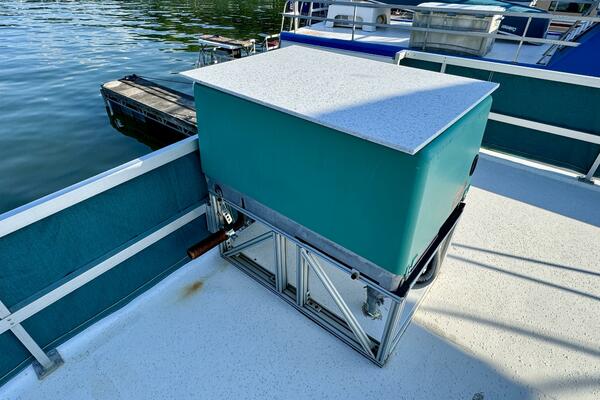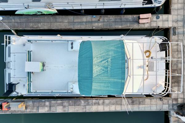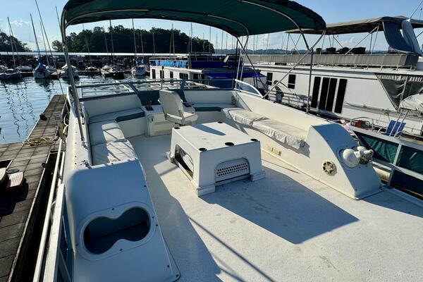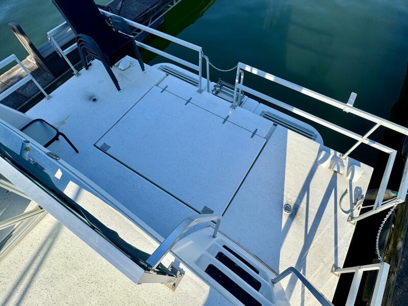 A small staircase just forward and port of the engine hatch will lead you up to the sun deck where you'll find a newer 5.5Kw Onan Cummins Air-Cooled RV Quiet Gasoline generator that is equipped with a remote start from the main cabin. Moving forward towards the bow on the upper level you'll find a large flybridge with wrap around seating for 10 with three functional stereo speakers, an 8' sunbrella bimini top, and the upper helm complete with full controls, a vhf radio, engine instrumentation, and remote spotlight controls.