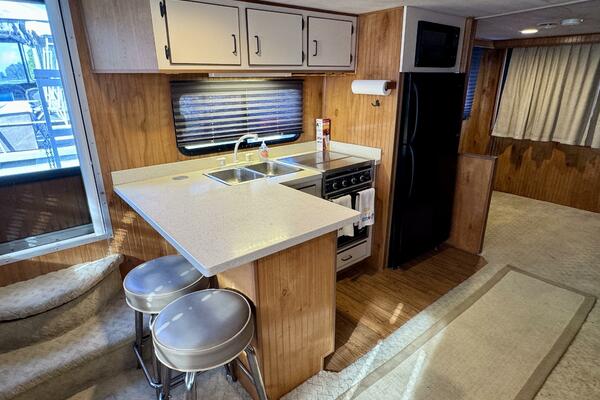 To starboard of the dinette and aft of the helm is an L-Shaped updated countertop with 2 bar stools, recessed power outlets, a double stainless sink, an electric 3-burner oven/range, electric refrigerator/freezer, integrated microwave, and several cabinets.