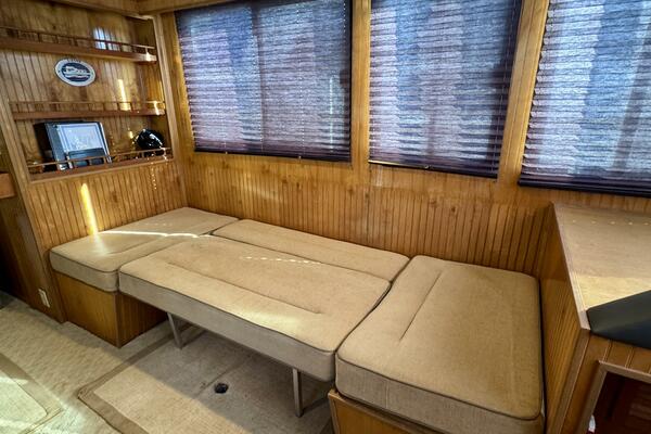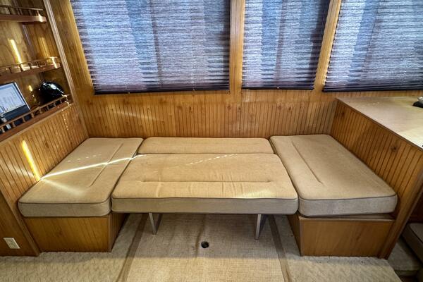 To port is a large convertible booth dinette with a custom removable teak dinette table. When converted to a berth the cushions make a Twin XL berth and storage shelves are to your aft. Midship and underfoot you'll find an in-floor integrated storage locker.