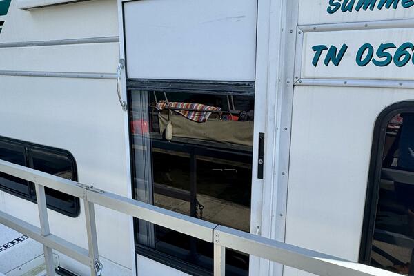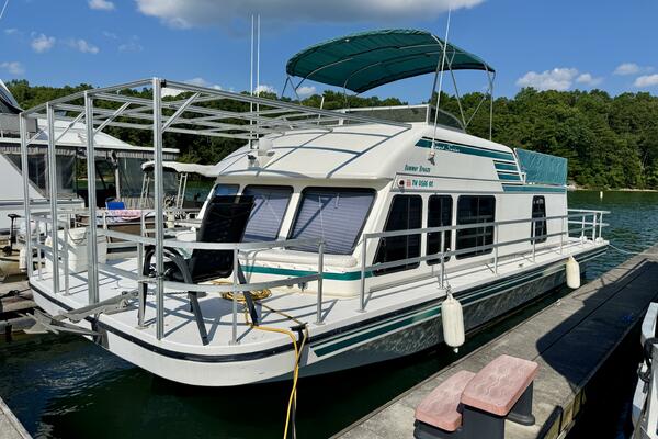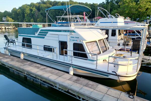 This 1995 Gibson 37 Sport Series Fiberglass Hull Houseboat For Sale on Cherokee Lake in East Tennessee is equipped with twin 5.0L Crusader counter-rotating 305CID inboard V-drive engines and features a 5.5Kw Onan air-cooled RV generator with remote start, a maxwell windlass anchor, an aluminum framed bow shade cover, a roof-mount ducted central air conditioning dometic RV-style AC unit, an electric refrigerator/freezer, 3-burner electric oven/range, microwave, a convertible dinette, forward cuddy berth, and room for a master bed in the aft, plus a full head with a vanity sink, marine head, and walk-in shower.