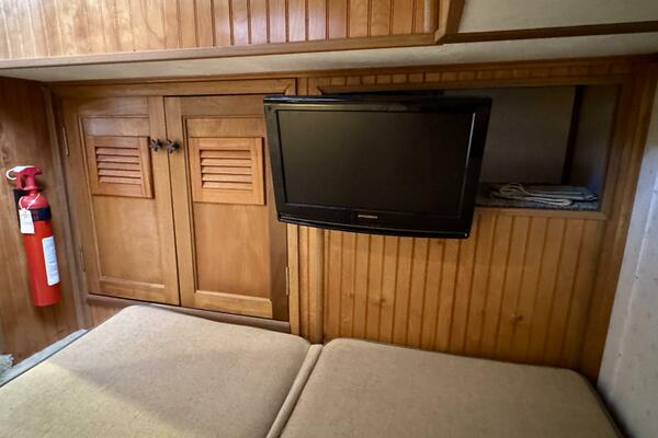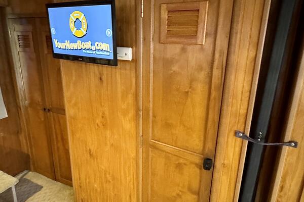 Forward of the dinette and just to port of the lower helm is the forward cuddy with a full size berth, hanging locker, 19'' TV with integrated DVD player and a hatch overhead to allow for more air flow.