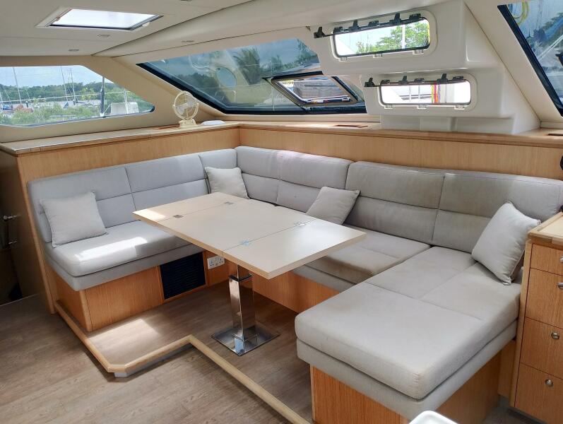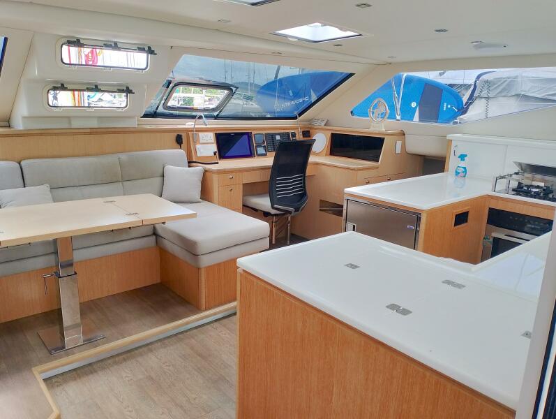 The interior showcases Seawind’s commitment to quality craftsmanship, with lightweight foam-cored construction, light oak finishes and modern walnut flooring that create a bright, contemporary feel. Indoor and outdoor living flow seamlessly, thanks to a large sliding saloon door and window that open to an expansive cockpit with seating for eight and a large dining table under a sturdy hardtop bimini.