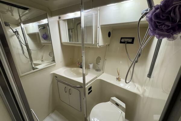 The interior is a bright and spacious salon with a oversized lounge that converts to a dinette, a flat-screen television mounted on a swivel for viewing from both the salon and single forward berth. The galley features a large Danby refrigerator, ice maker, Panasonic microwave, three-burner electric stove, sink, and generous cabinetry. The private head is accessible from both the salon and forward berth, offering a separate shower partition with VacuFlush head as well as a dedicated dry vanity area with sink and and large mirror. Message or call us to book a private viewing!