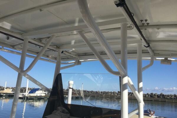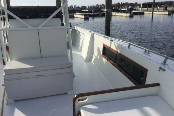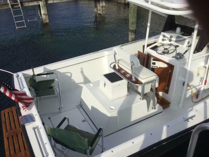 Removed rub rail, de rigged deck, removed Mahogany around aft deck and fuel tank fills, removed decking from fuel fill back across transom, removed pine blocking, grind and fit new White Oak, West System in place, cut and fit new composite decking, West System in place, lay-up, cut out port and starboard mid-ship 6' area, grind and fit 6" x 2" White Oak, cut and fit bulkheads to reinforce lifting area, glassed bulkheads in place, glued in White Oak, cut and fit composite and West System in place. Scuff grind and lay up areas, scuff grind and body work, prep and match gelcoat, scuff and buff. Put deck back together, cut and fit White Starboard material in place of Mahogany, clean up.